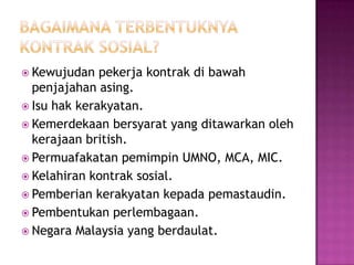 Keputusan Kontrak Sosial Kedudukan Raja-Raja Melayu Kedudukan Agama Islam Kedudukan Bahasa Melayu Hak Istimewa Orang Melayu Hak Kerakyatan. Kontrak sosial pengajian malaysia. Huraian isi kesan kontrak sosial BAHASA MELAYU.